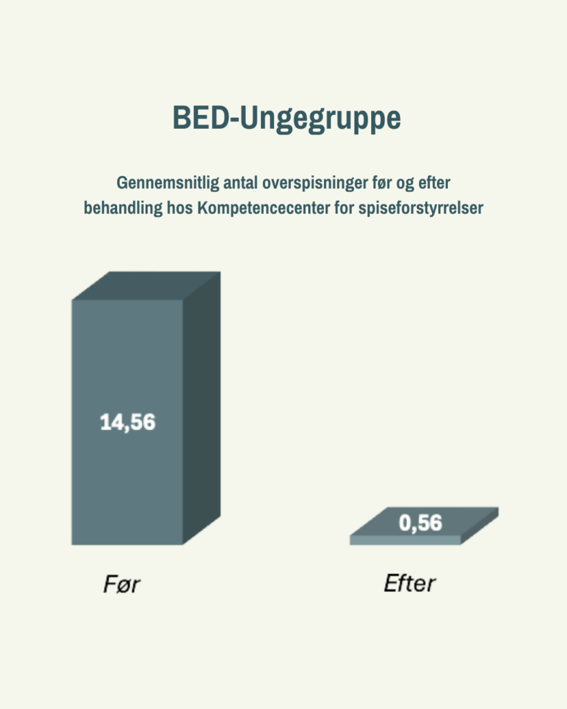 BED-ungegruppe: I gennemsnit havde deltagerne 15 overspisninger om måneden den sidste måned før behandlingsstart. Ved afslutning havde de i gennemsnit haft 0,56 overspisninger den sidste måned.
