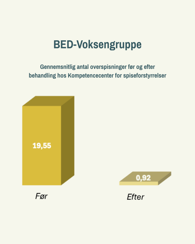 BED-voksengruppe: I gennemsnit havde deltagerne 20 overspisninger om måneden den sidste måned før behandlingsstart. Ved afslutning havde de i gennemsnit haft 0,92 overspisninger den sidste måned.